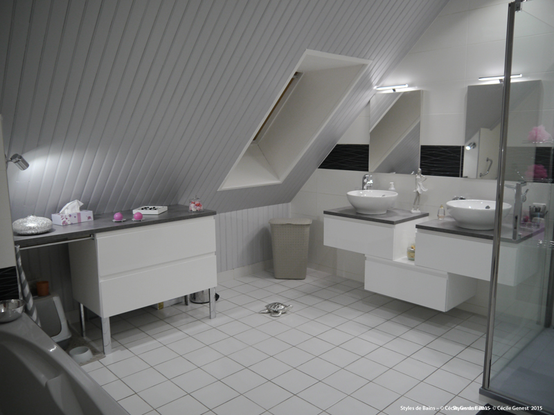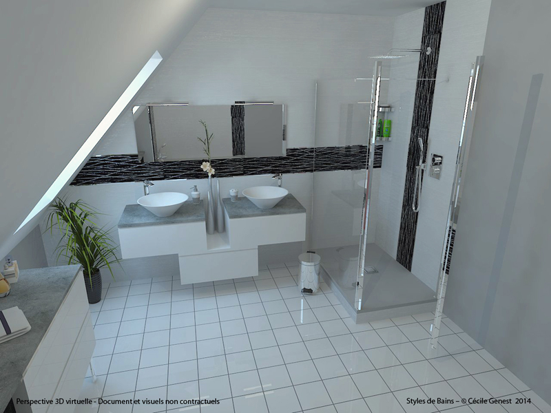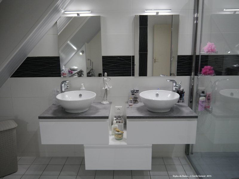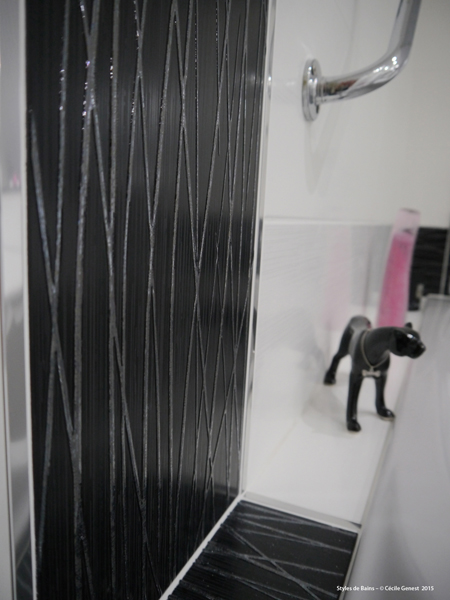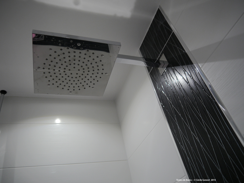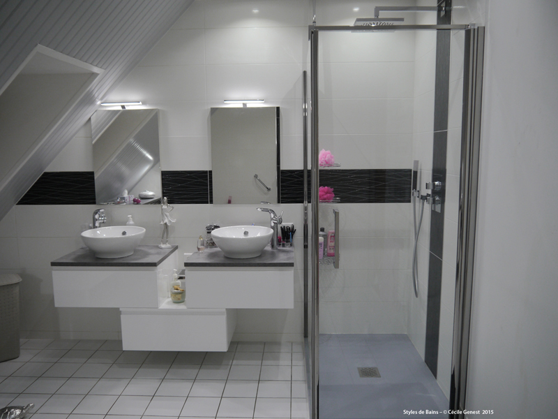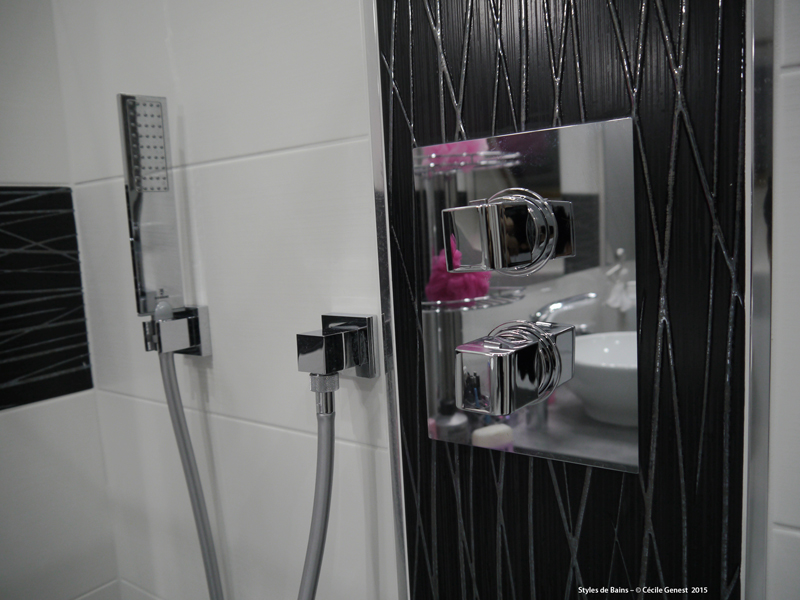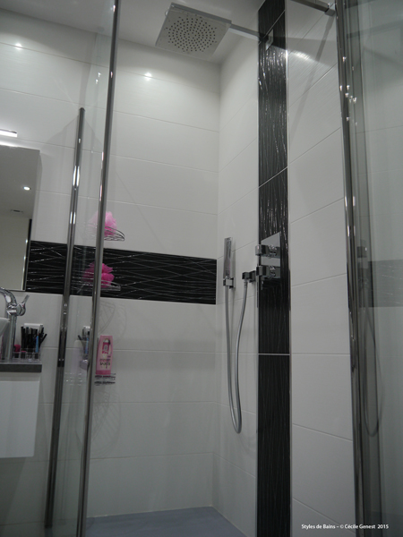 faïence 25*75 bianco et décors negro, profilé chromé décoratif, ensemble meubles Discac, receveur en résine 120*80 Mc Bath RAL 7040, paroi Novellini, robinetterie thermostatique encastrée Modus Frattini. |