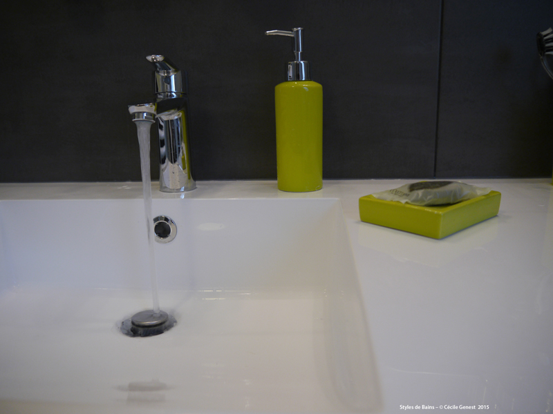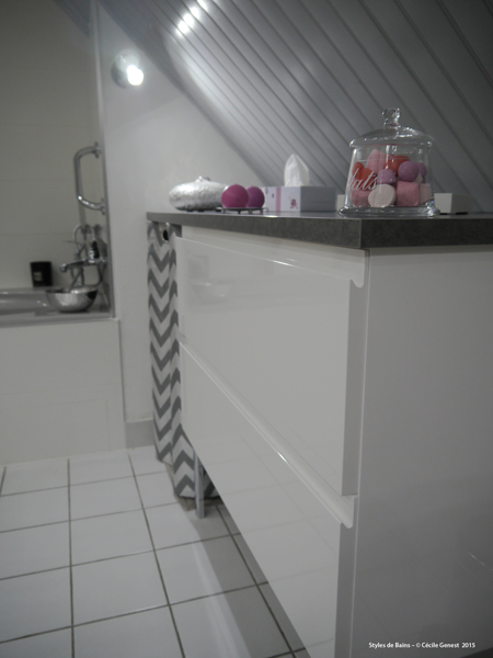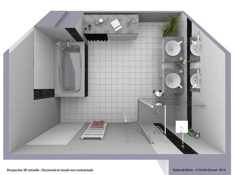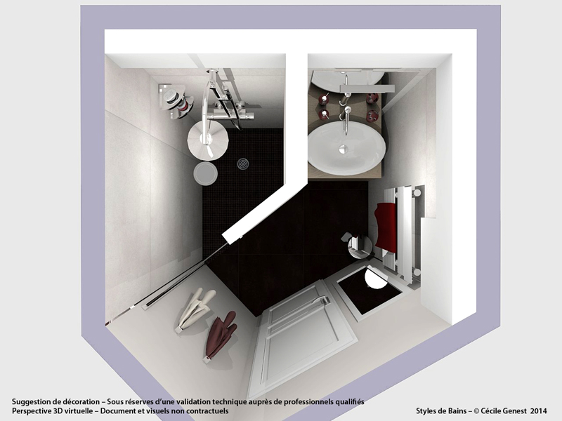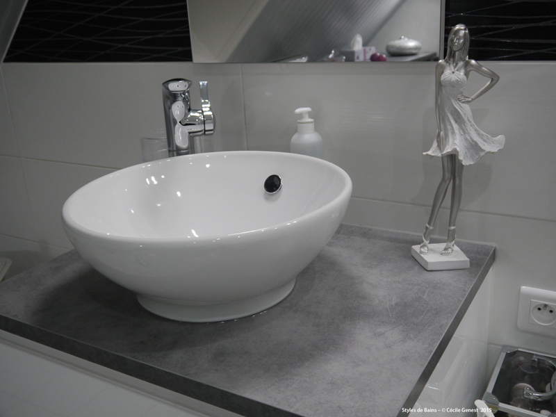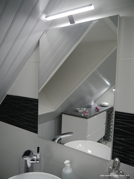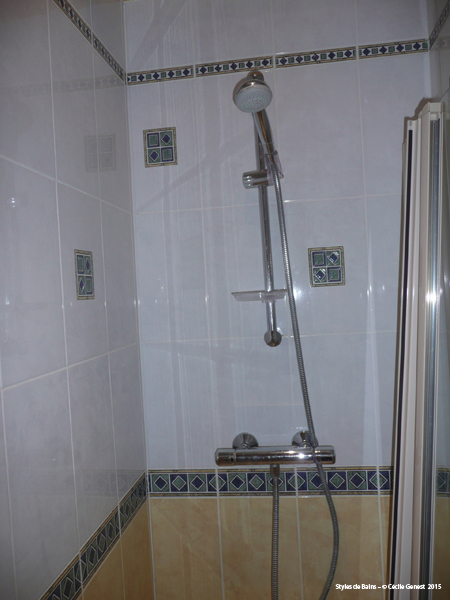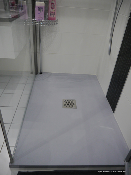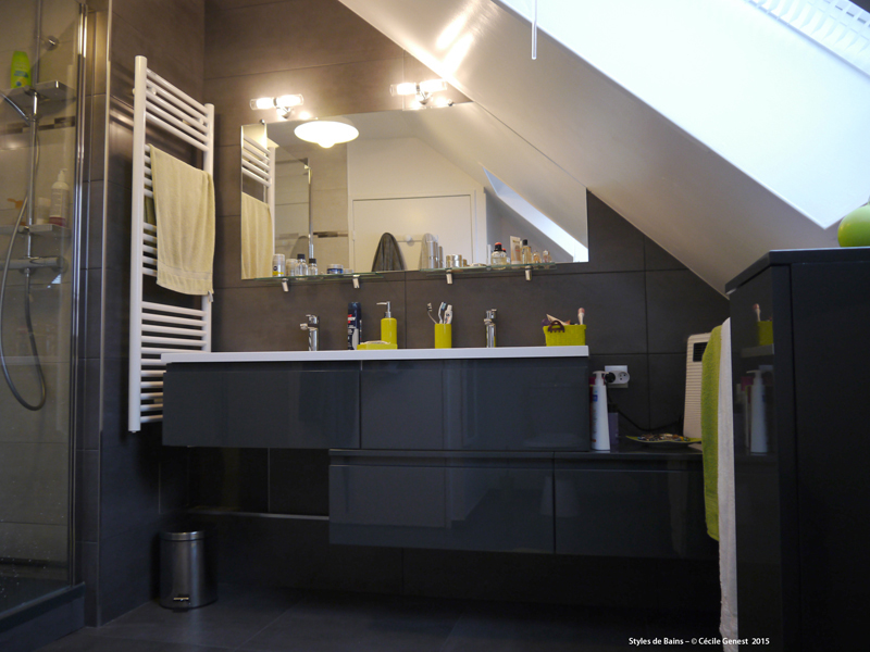 faïence 25*75 bianco et décors negro, profilé chromé décoratif, ensemble meubles Discac, receveur en résine 120*80 Mc Bath RAL 7040, paroi Novellini, robinetterie thermostatique encastrée Modus Frattini. |