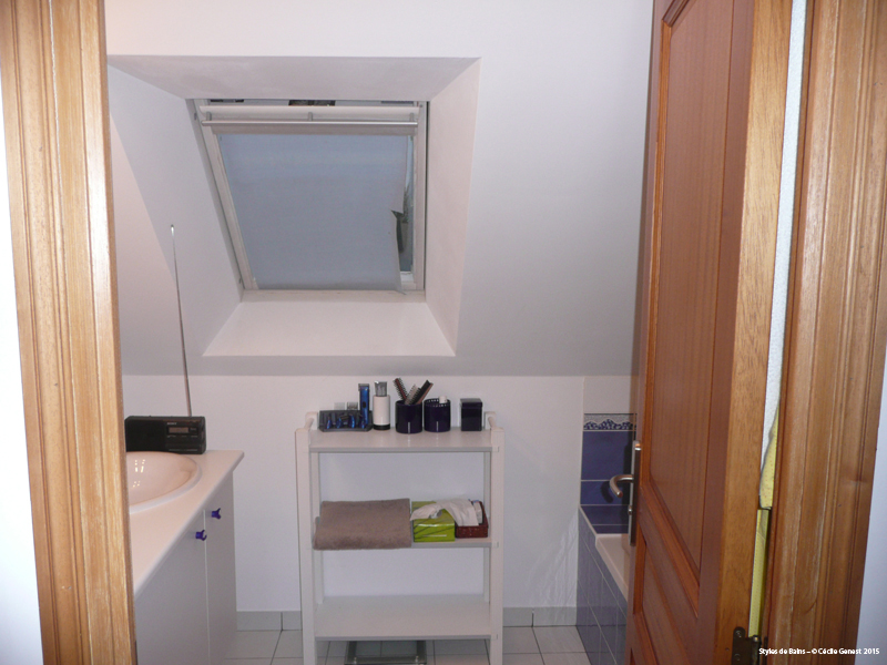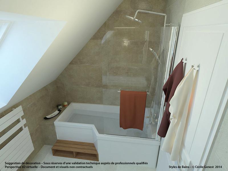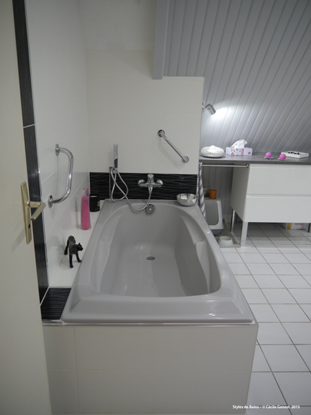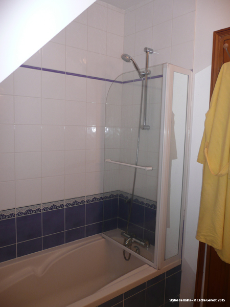 une grande salle de bain pour jeunes filles où l'on garde la baignoire et le carrelage, avec création d'une douche. |