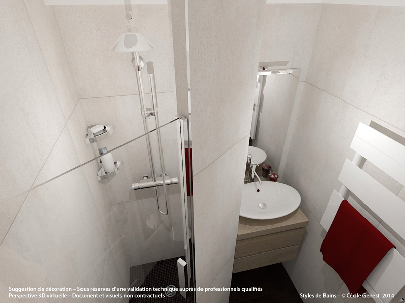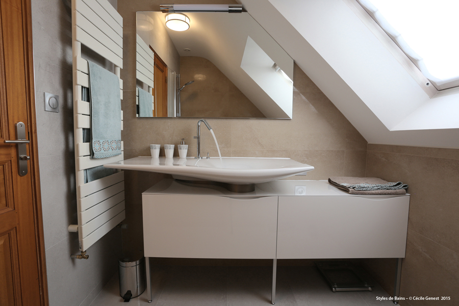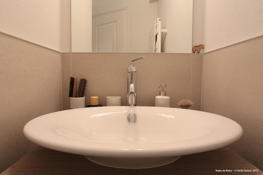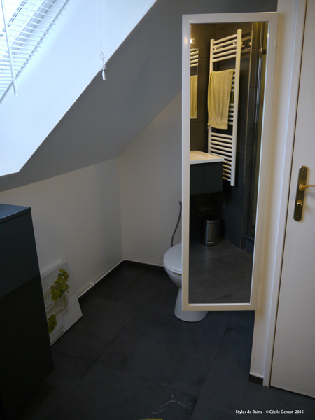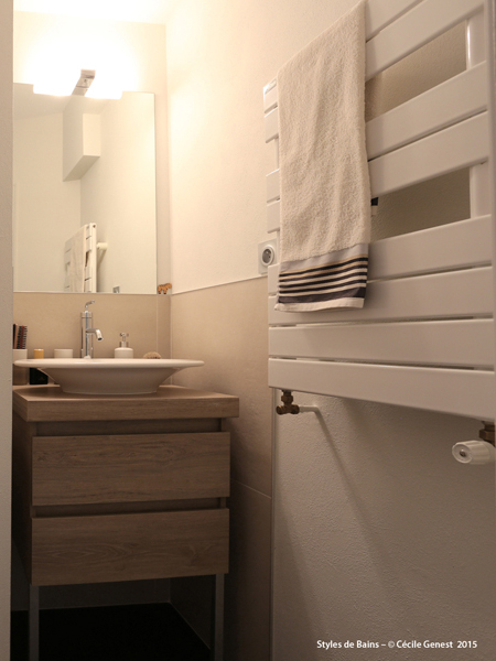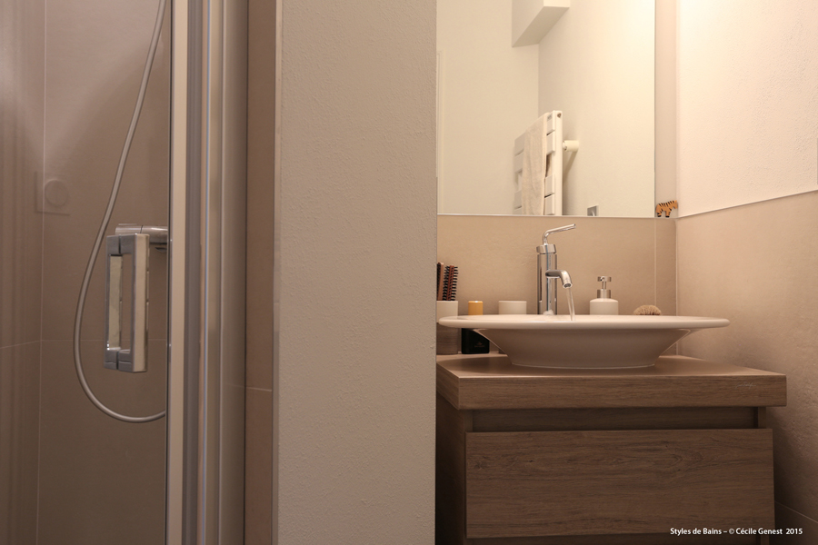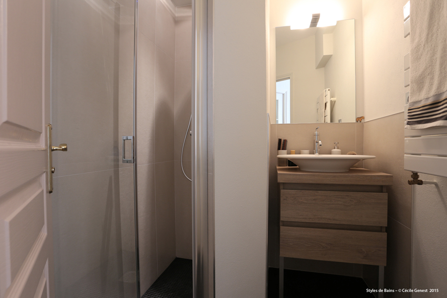 une petite salle d'eau où l'on recherche du confort et de l'ergonomie : suppression de la baignoire pour une grande douche avec un banc en assise, meuble faible profondeur. |