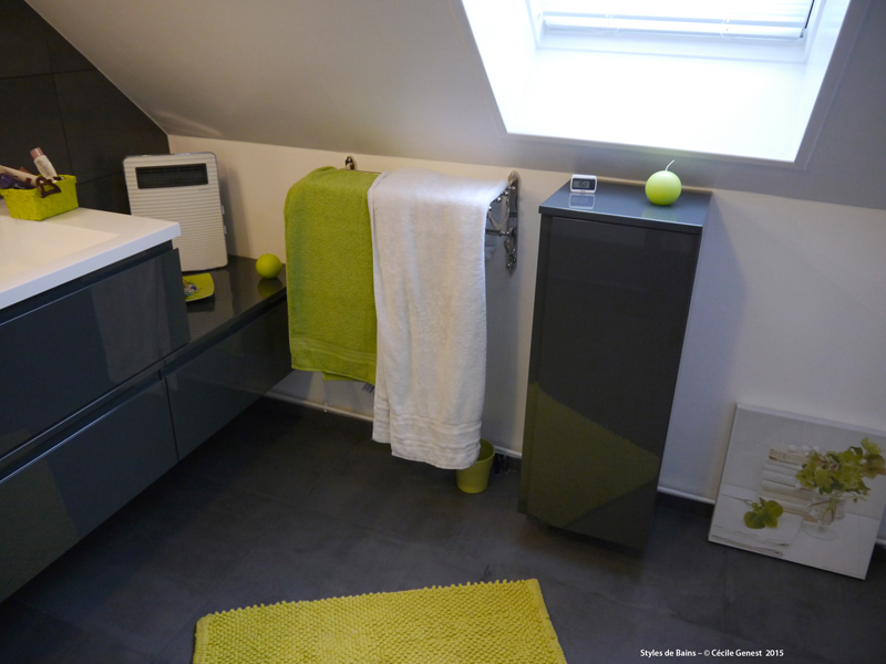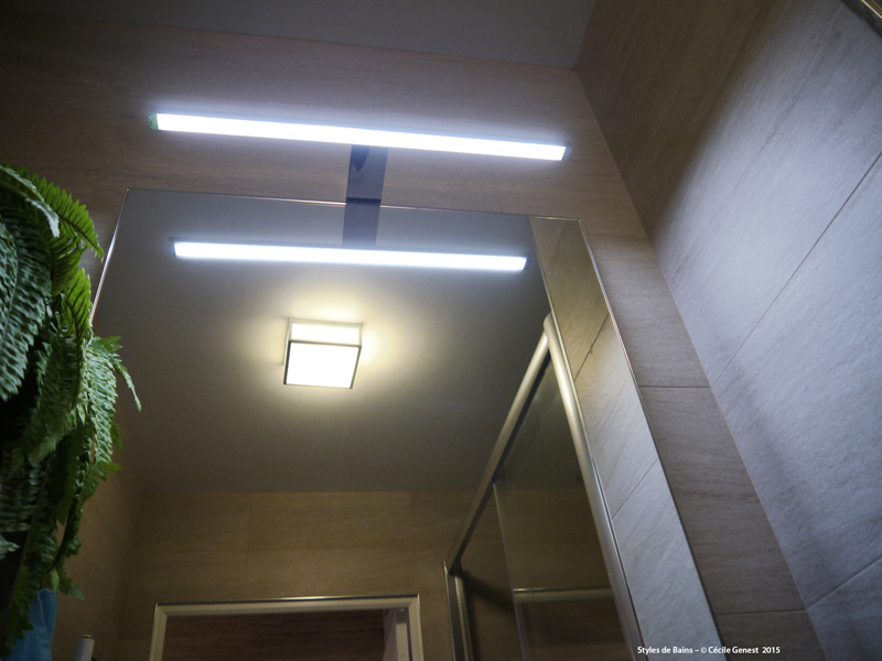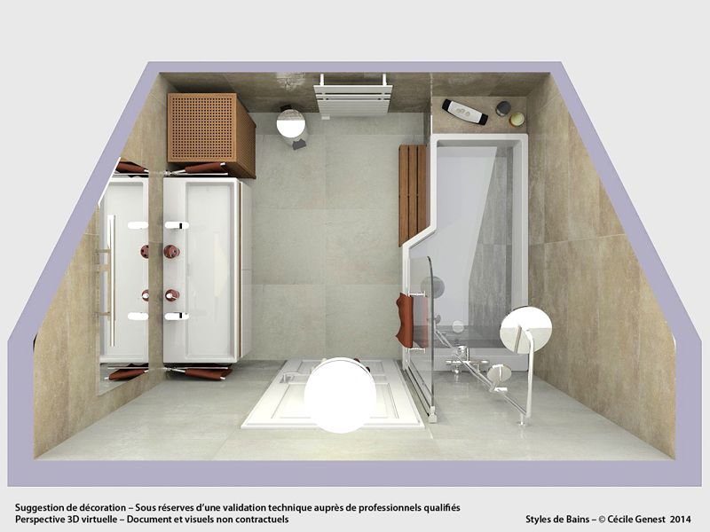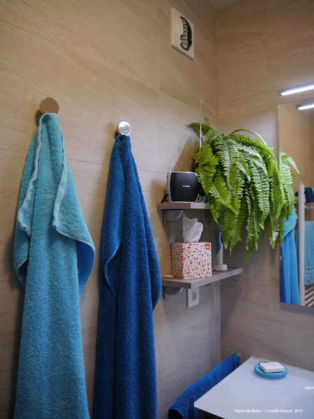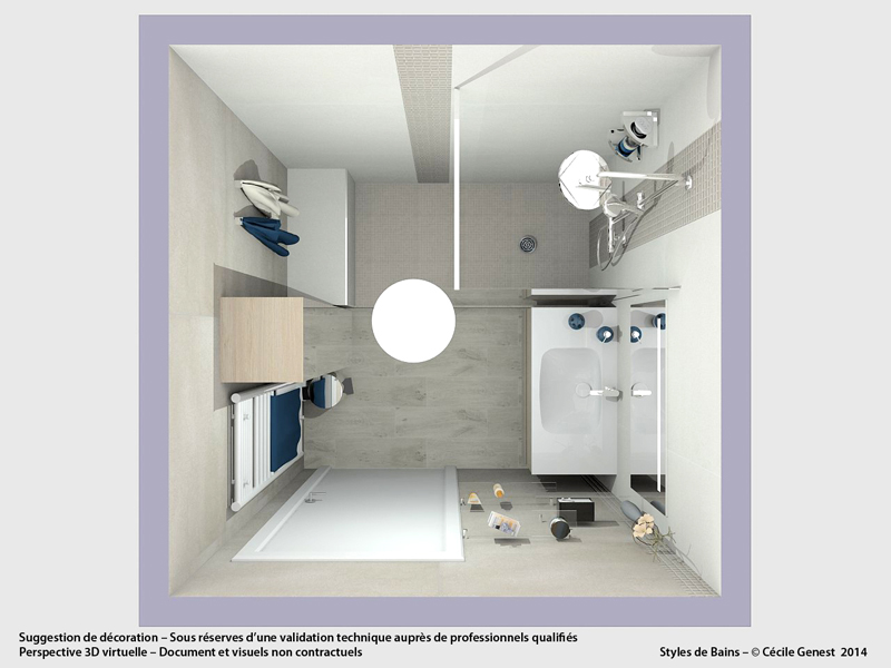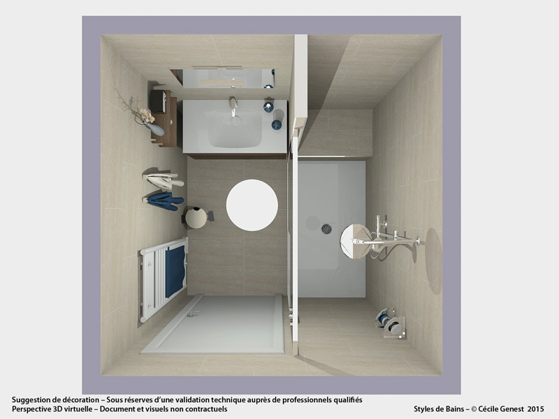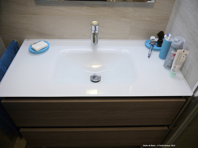 une petite salle d'eau où l'on recherche du confort et de l'ergonomie : suppression de la baignoire pour une grande douche avec un banc en assise, meuble faible profondeur. |
