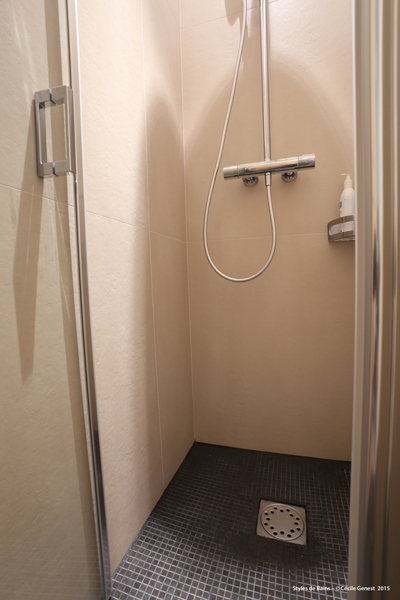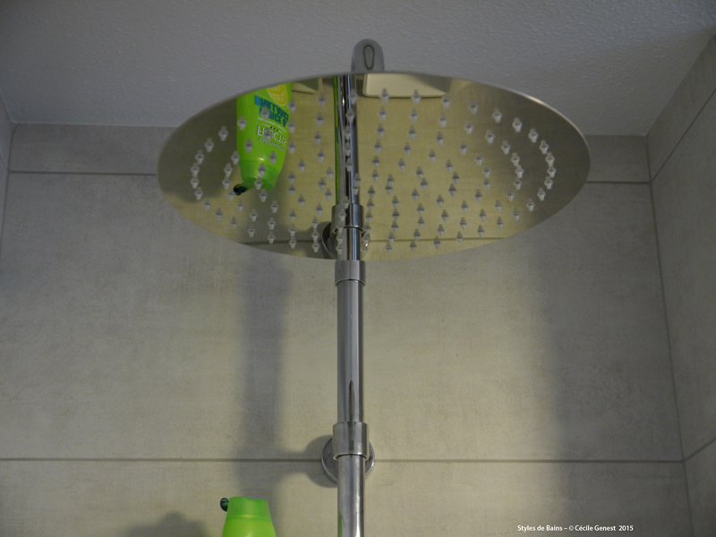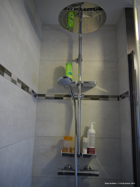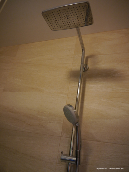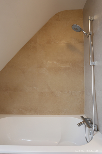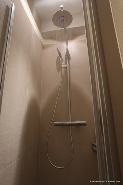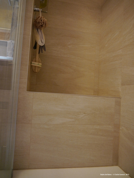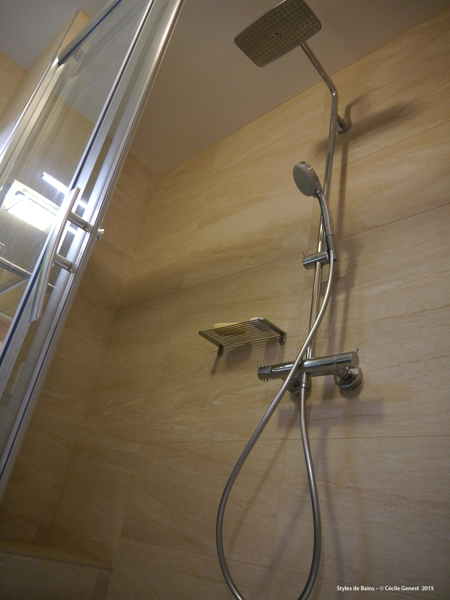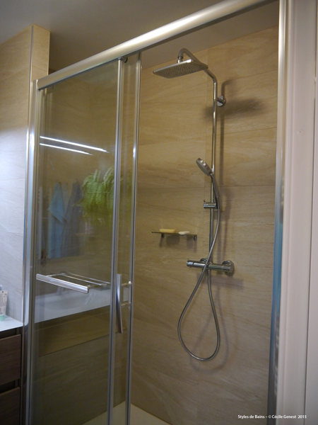 carrelage pleine masse 30*60 effet pierre naturelle sol et murs, ensemble meubles Discac, receveur en résine 140*80 texture ardoise blanc Aquabella, paroi coulissante Rothalux sans seuil, robinetterie Showerpipe Hansgrohe. |