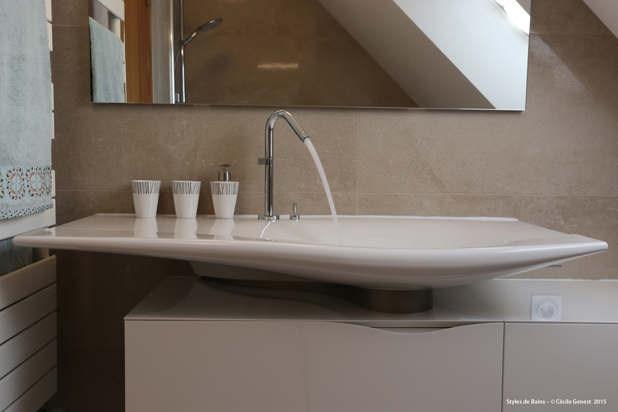 une salle de bain élégante, aux lignes courbes et contemporaines. |