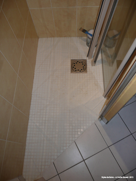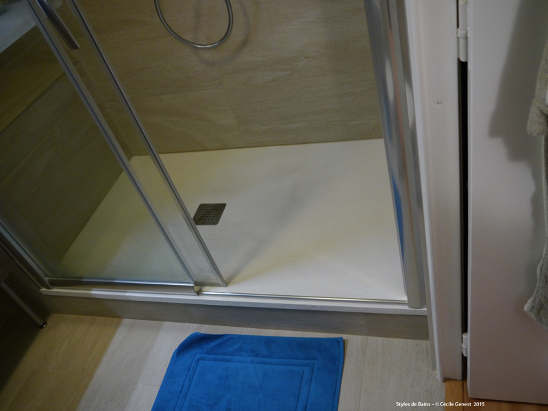 une salle de bain que l'on transforme en salle d'eau pour plus de confort et un look plus moderne : suppression de la baignoire pour une douche XXL de la même dimension, nouveaux revêtements de sol et murs. |