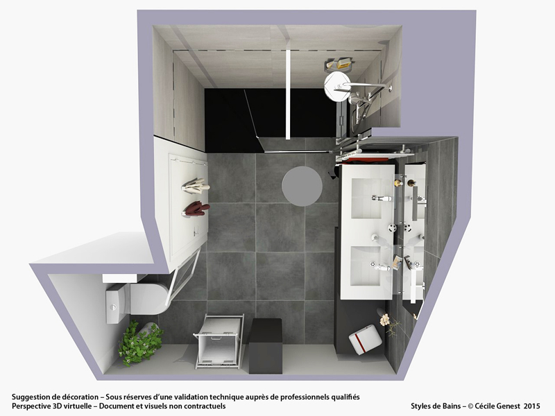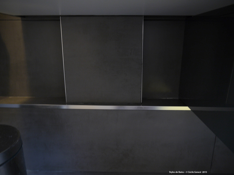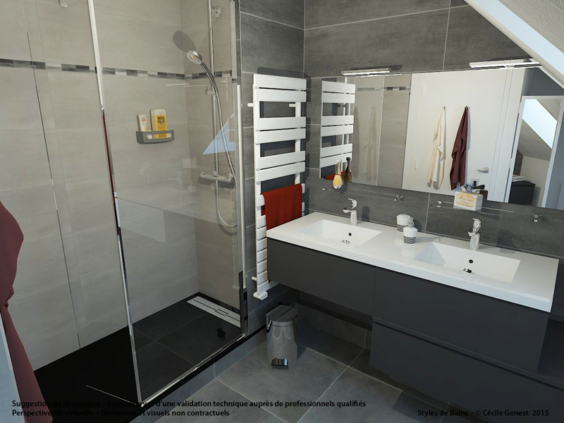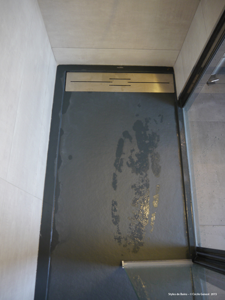 faïence murale XL 30*90 Marengo & Perla, carrelage sol 60*60 Marengo, meuble vasque Discac, miroir sur-mesure, receveur en résine 170*75 texture pierre graphite avec caniveau Mc Bath, paroi fixe + déflecteur Novellini, robinetterie Valentin. |