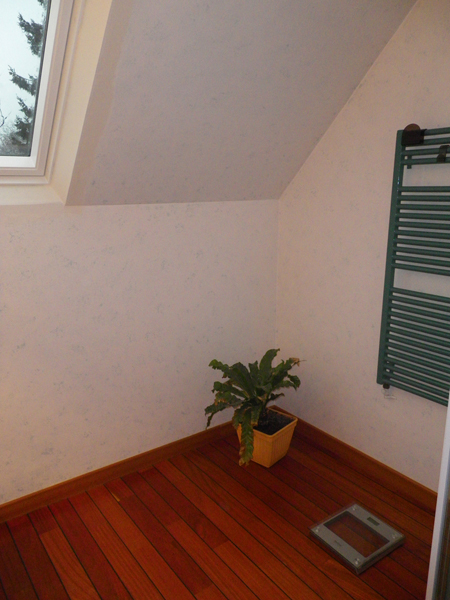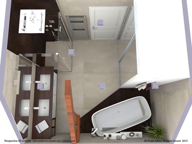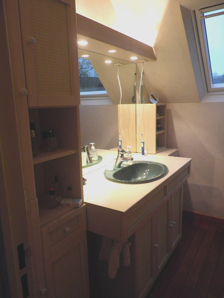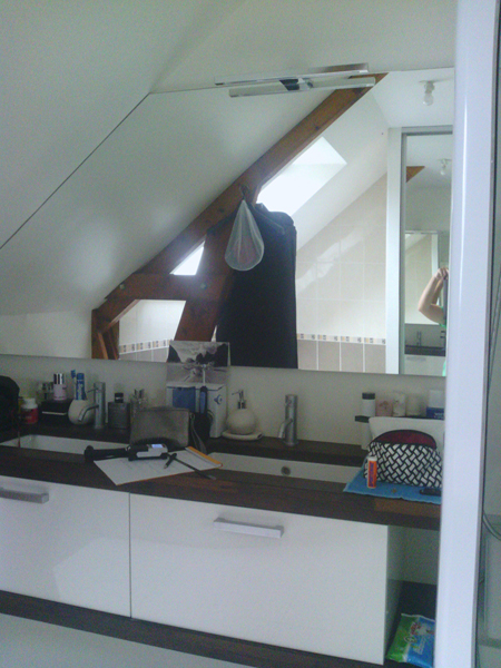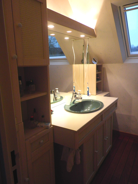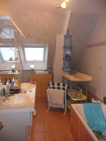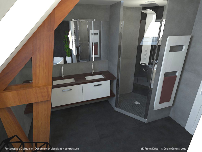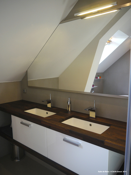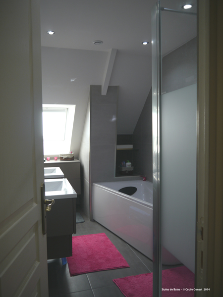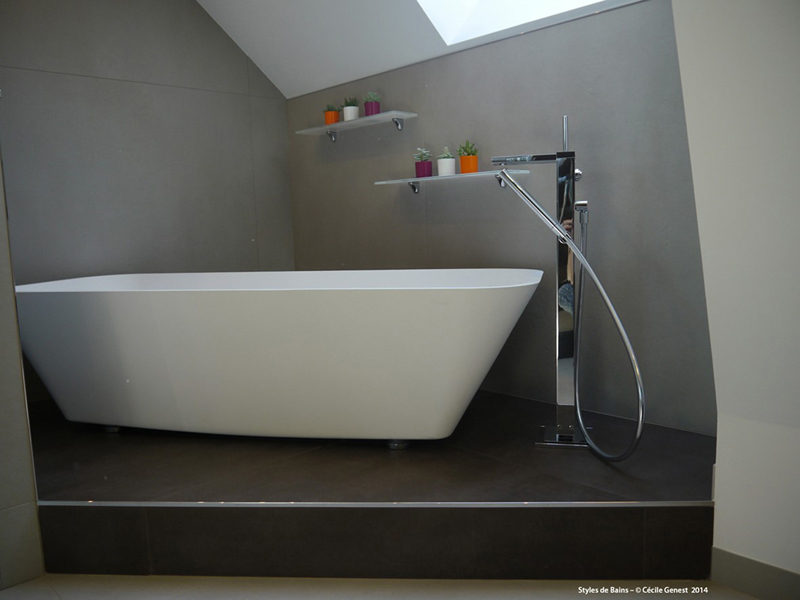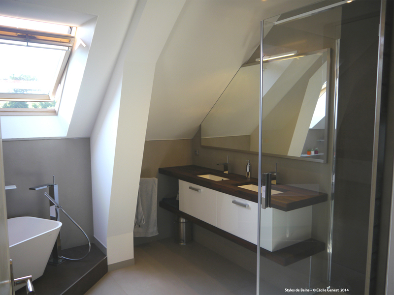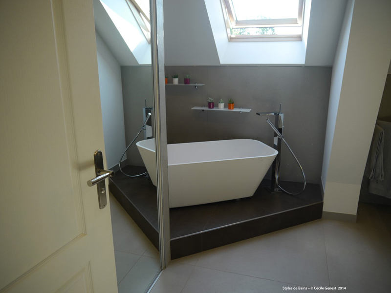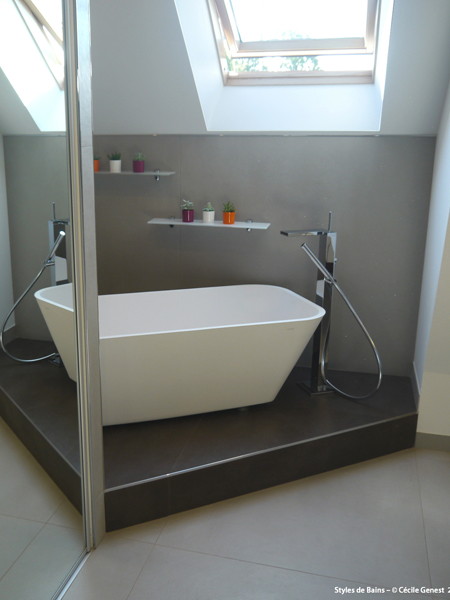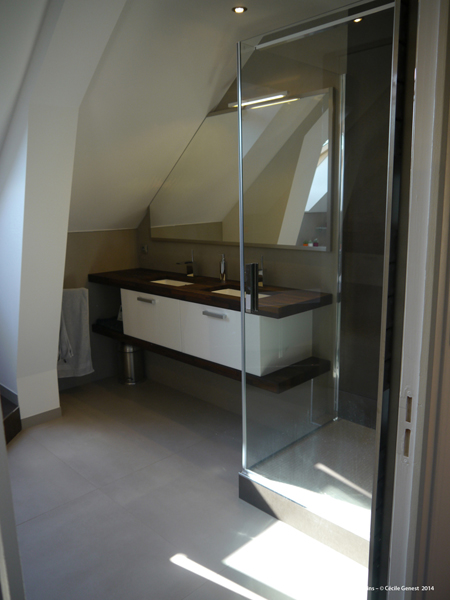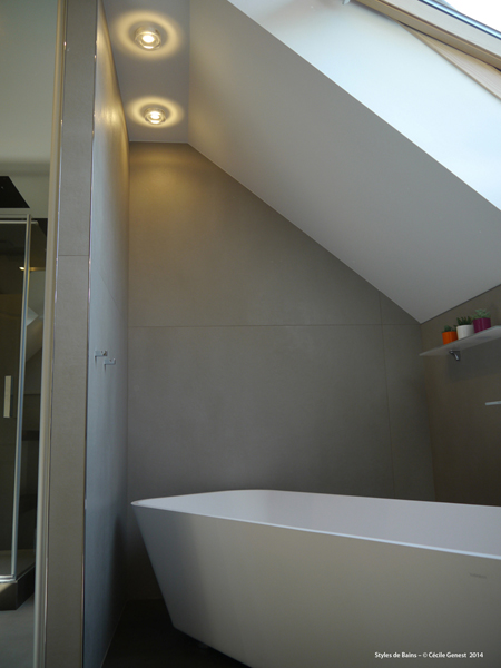 sous les rampants, on favorise les rangements et le positionnement de la baignoire, on part sur des tons doux et nuancés pour une ambiance cosy et chaleureuse. |