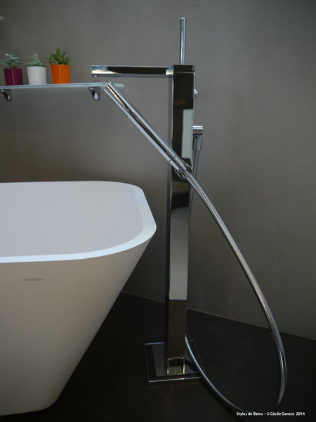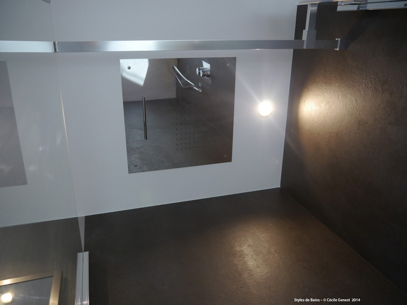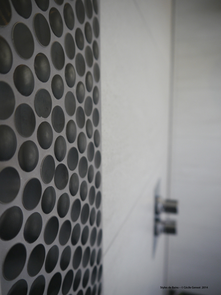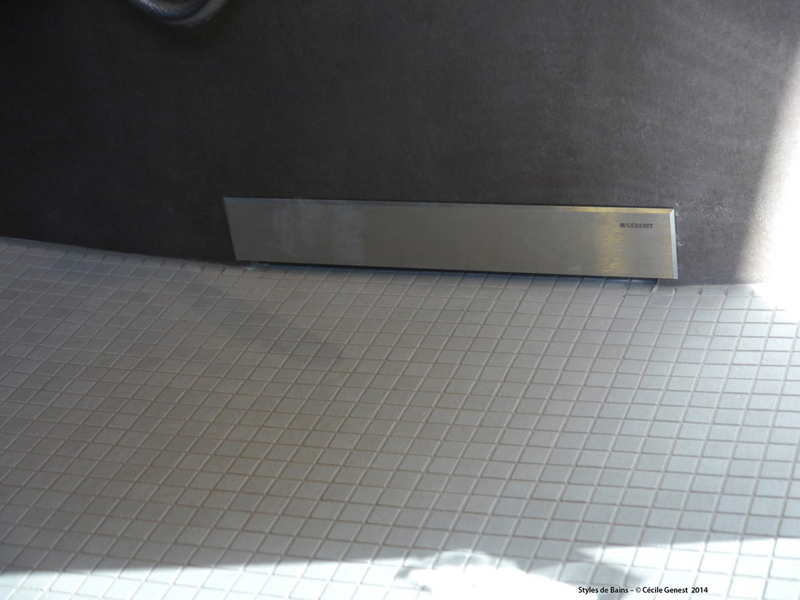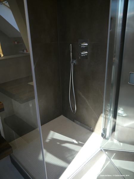 carrelage faible épaisseur XXL (120x120) au sol et aux murs, une douche de tête encastrée 2 jets (cascade & pluie) Nobilis, et une douche à l'italienne avec évacuation murale Geberit, enfin, une belle baignoire ilot en résine Hidrobox Alfa posée sur une estrade avec robinetterie sur pied Modul de chez Cristina. |