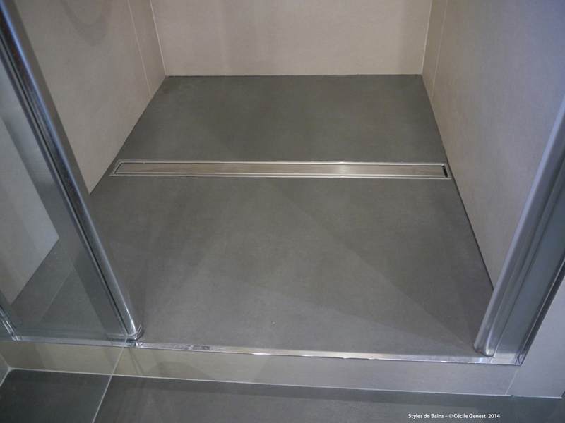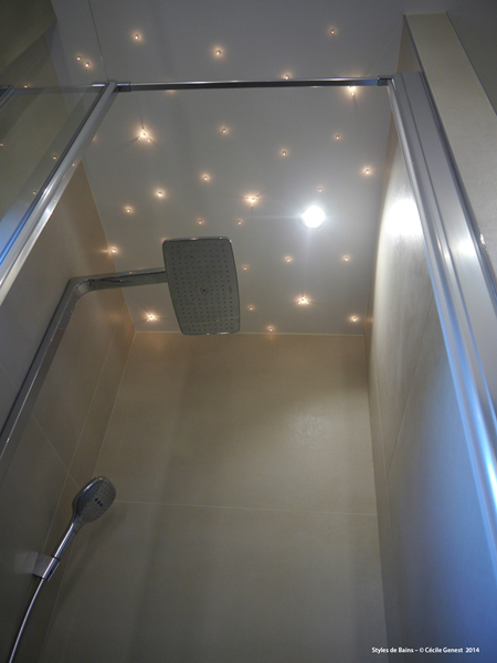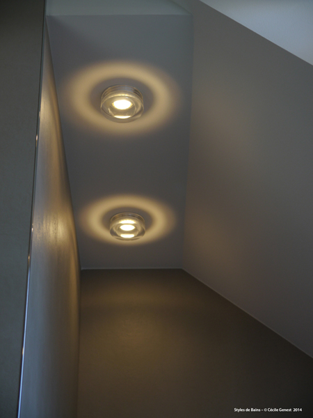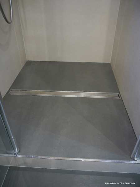 carrelage au sol, remonté sur les murs, en format XL(90x90), une colonne Showerpipe Raindance Hansgrohe avec tablette intégrée, une douche à l'italienne avec caniveau central (sans joint), et un plafond LED Dipline® pour l'éclairage indirect. |