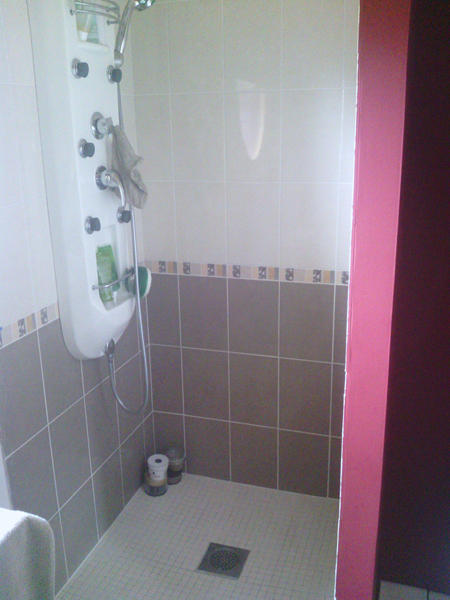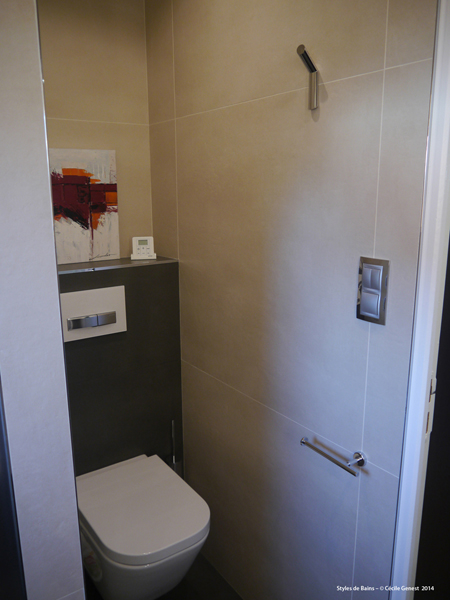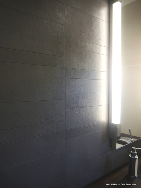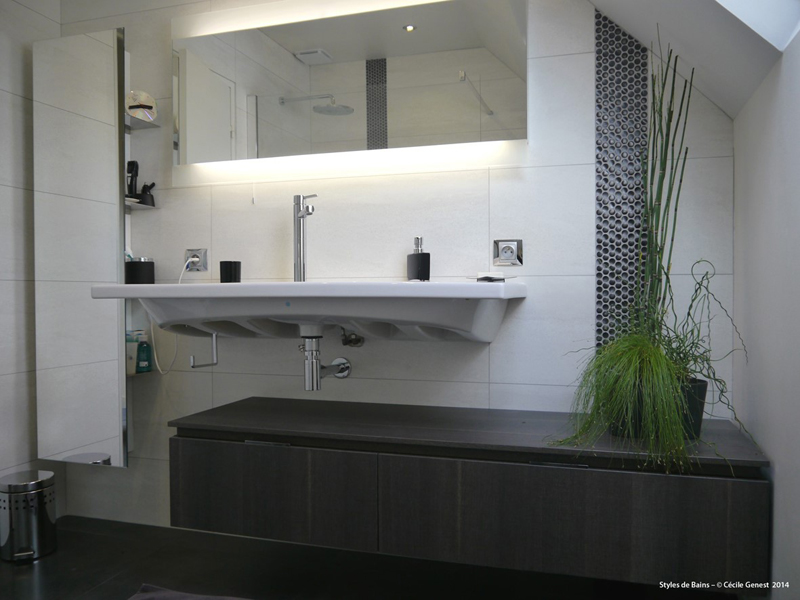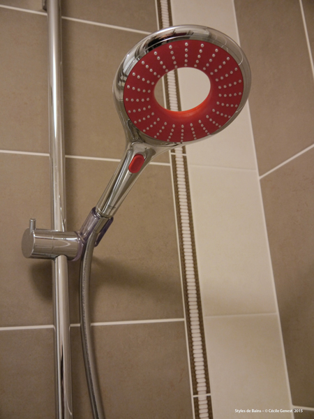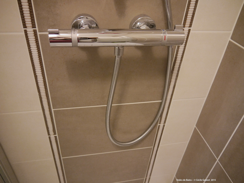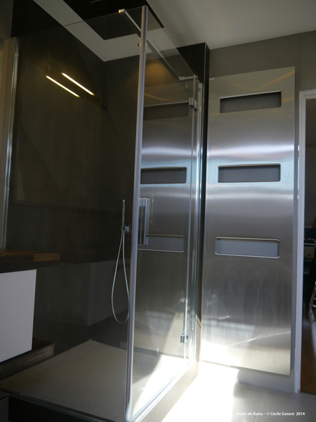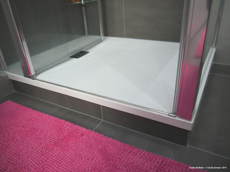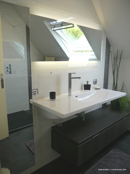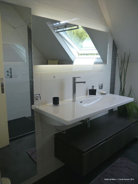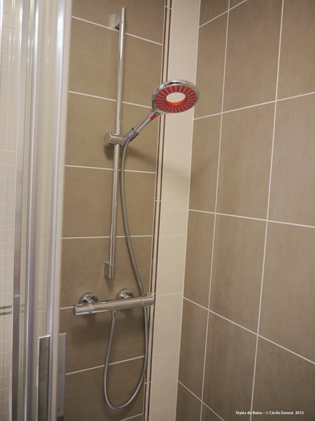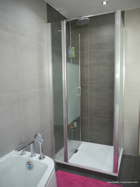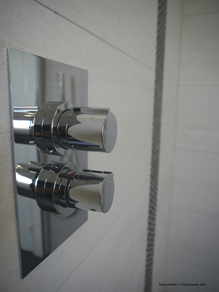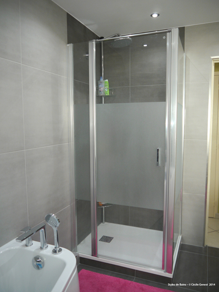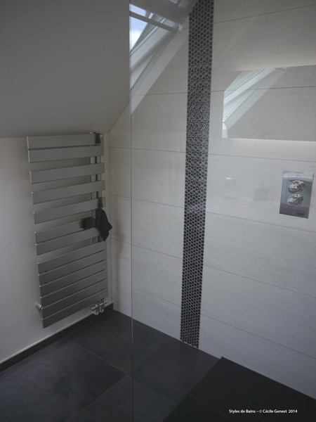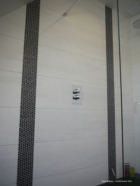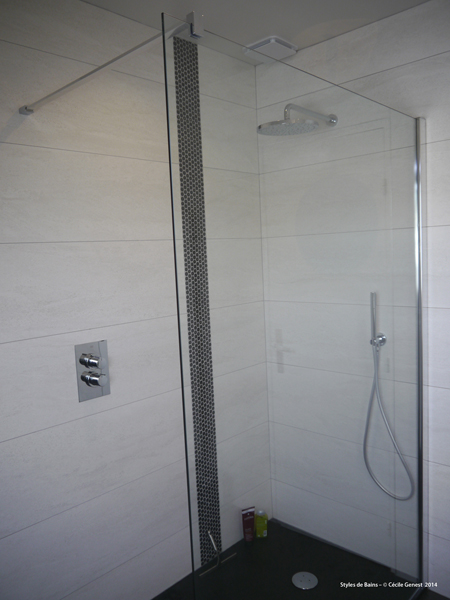 faïence 25*40 smoke&white, listel décor et carrelage au sol 30*60, ensemble meubles Discac, receveur 120*80 Selles, paroi Rothalux, mitigeur thermostatique et douchette Rainshower Icon rouge de Grohe. |
