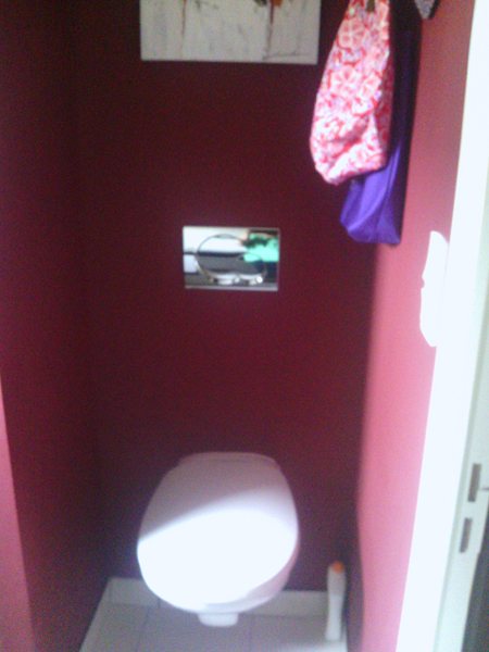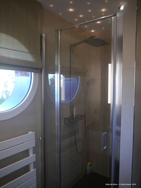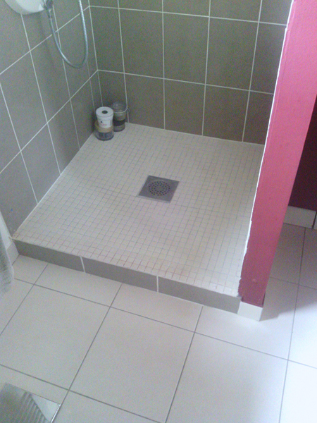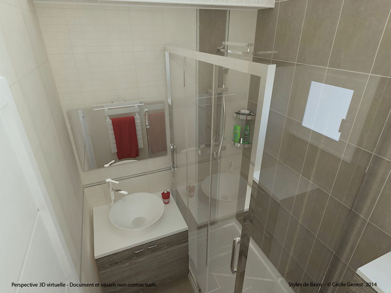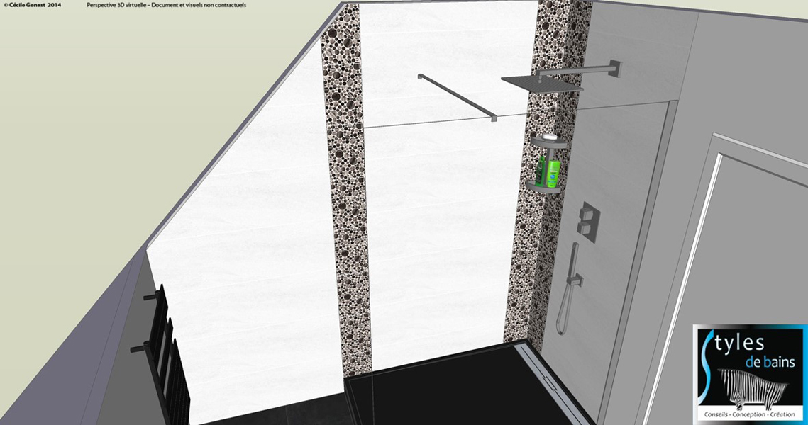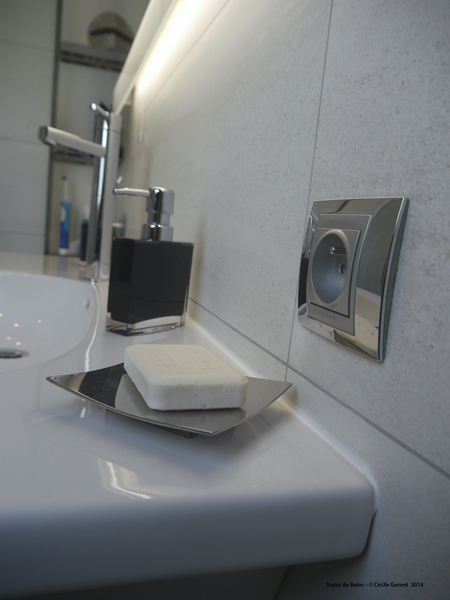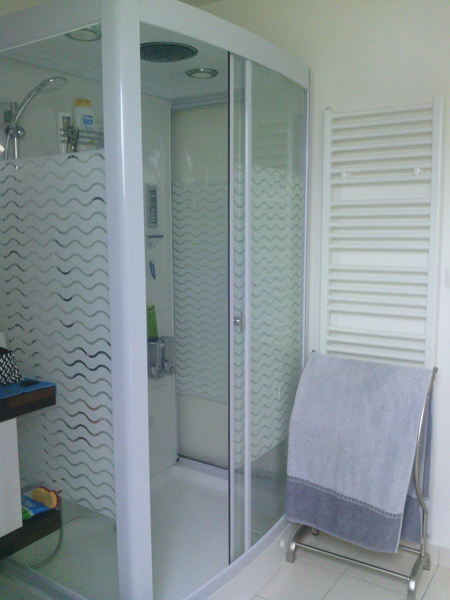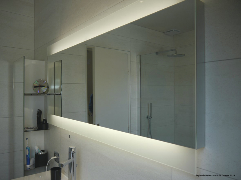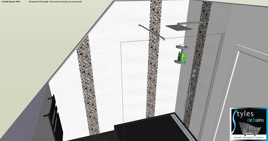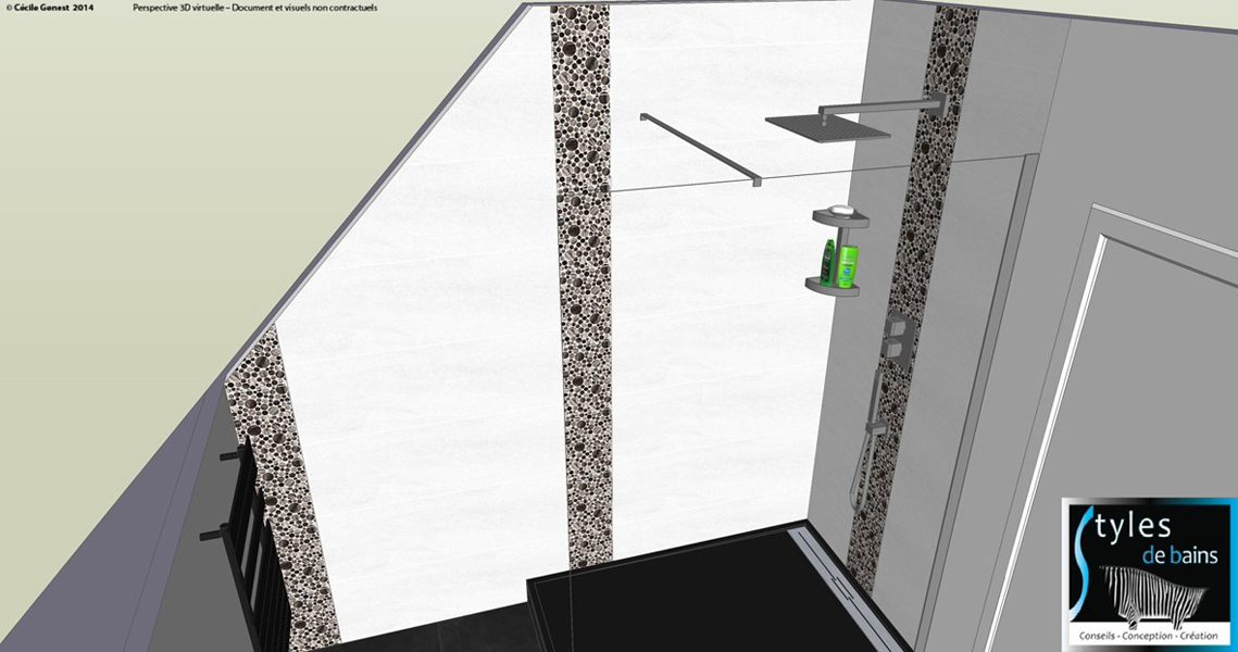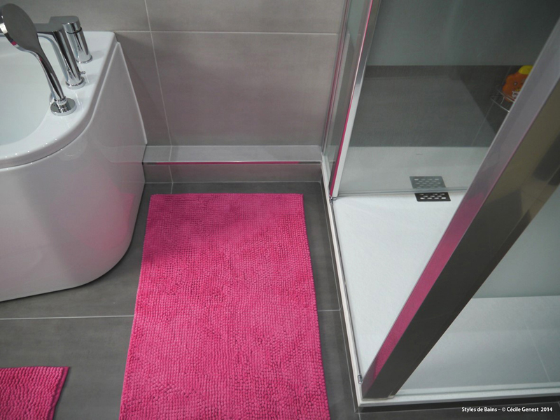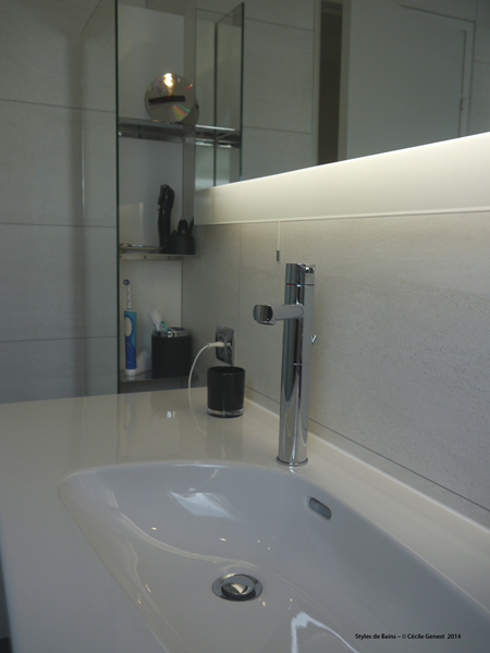 faïence 25*40 smoke&white, listel décor et carrelage au sol 30*60, ensemble meubles Discac, receveur 120*80 Selles, paroi Rothalux, mitigeur thermostatique et douchette Rainshower Icon rouge de Grohe. |